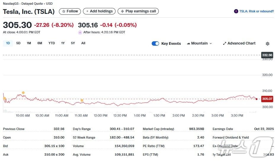 24일(현지 시각) 뉴욕증시에서 테슬라는 8.20% 폭락한 305.30달러를 기록했다. 이는 전일 시간외거래보다 낙폭을 크게 늘린 것이다. 전일 시간외거래에서 테슬라는 5% 정도 급락했었다.