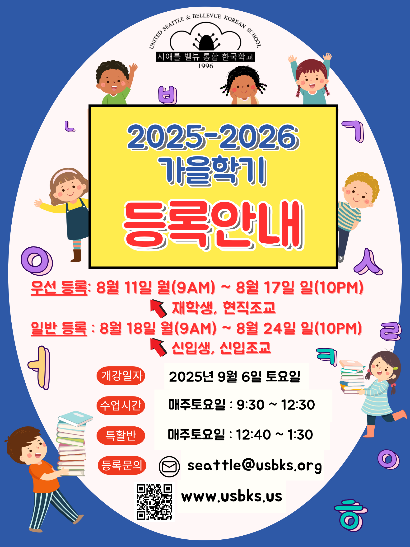워싱턴주에서 가장 오랜 전통을 자랑하는 시애틀통합한국학교(교장 임수진)가 2025~2026학년도 학생 등록을 받는다.