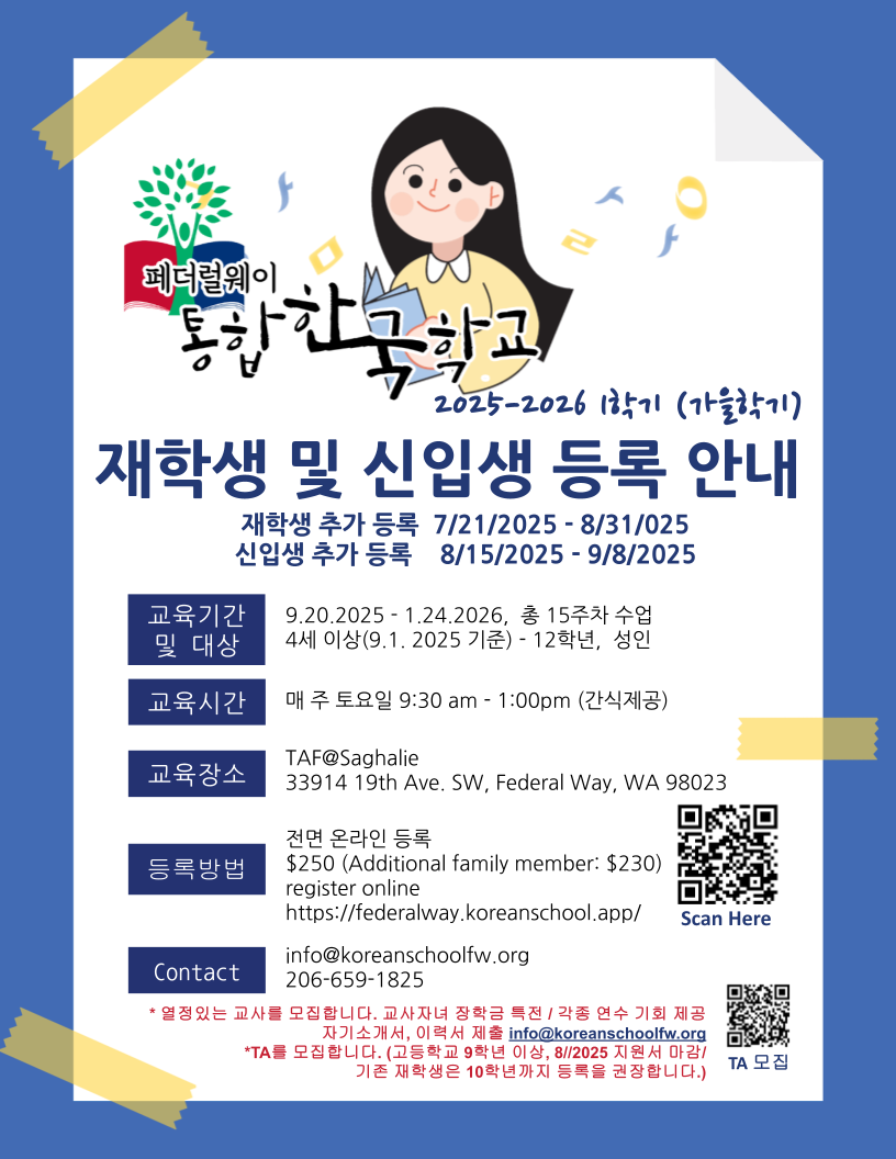 페더럴웨이통합한국학교(이사장 박영민, 교장 이재은)가 오는 9월 20일 개강하는 2025-2026학년도 가을학기 학생모집 마감을 앞두고 등록을 서둘러달라고 당부하고 있다. 등록 마감은 추가연장돼 8월 31일이다.