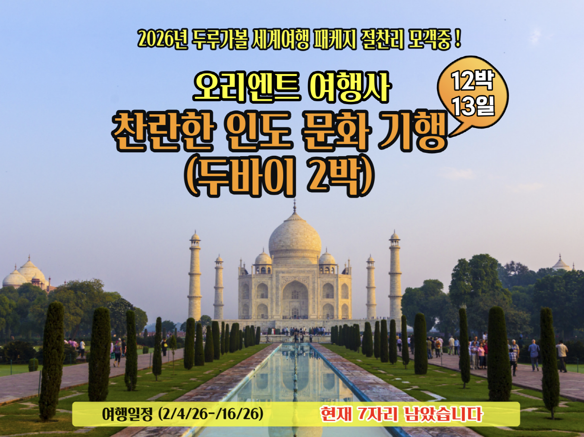 바로 내년 2월 4일(수) 시애틀을 출발해 2월 16일(월) 돌아오는 일정으로 진행되는 ‘찬란한 인도문화 기행’(feat. 두바이 2박) 12박13일 여행 상품이다.