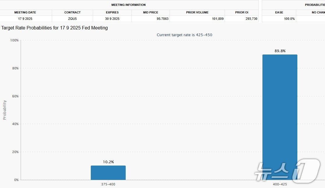 5일 오후 4시 30분 현재(현지 시각) 미국의 기준금리 선물이 거래되는 시카고상품거래소(CME)에서 연준이 9월 FOMC에서 0.25%포인트의 금리인하를 할 확률이 89.8%로, 0.5%포인트의 금리인하 확률은 10.2%로 각각 반영되고 있다.