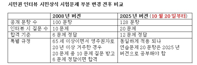 반면 2025년 10월 20일 이후에 시민권 신청서를 제출하는 신청자들은 새로 개정된 시민상식 시험문제 (연습문제 128문항)로 공부해 응시하게 된다.