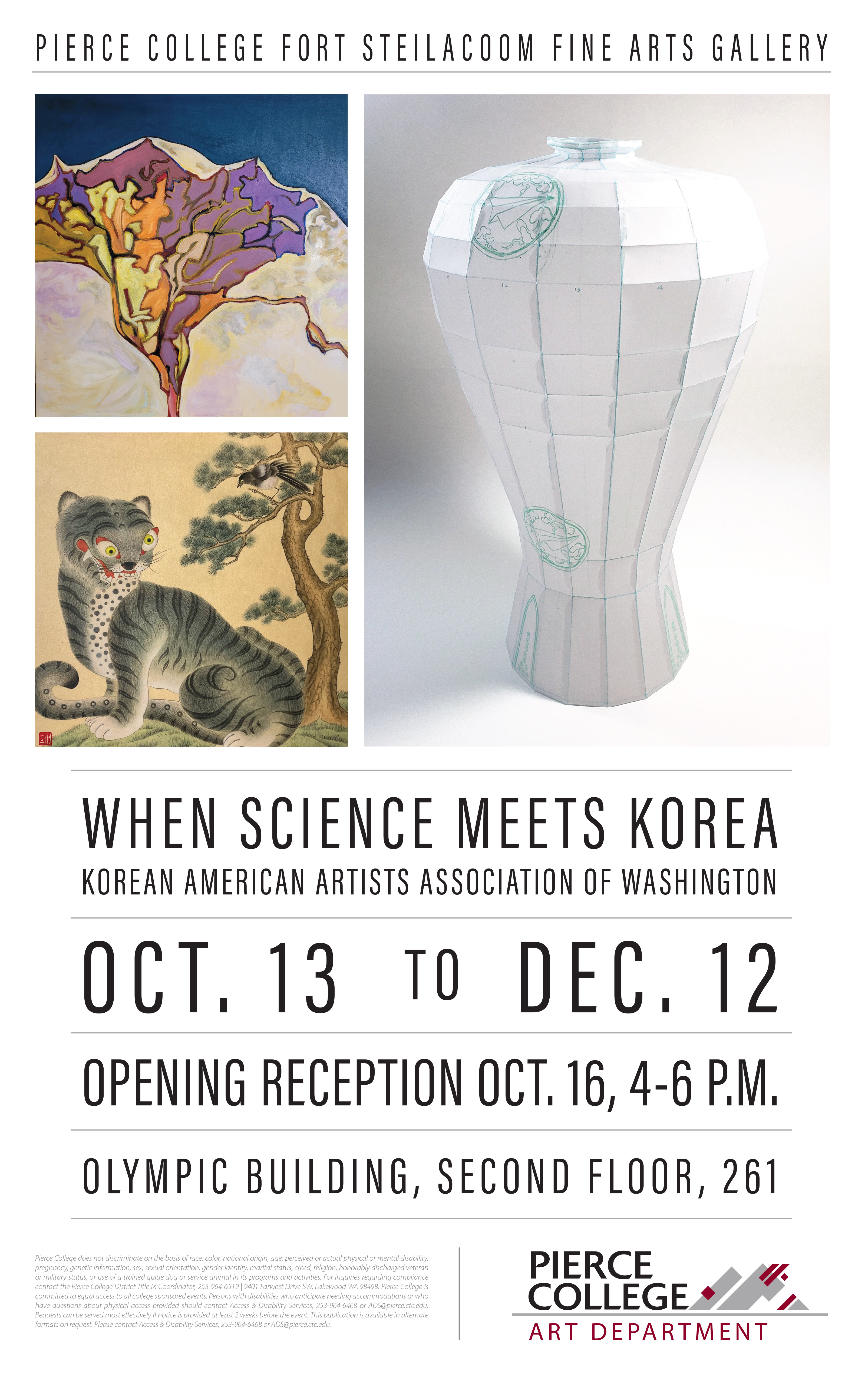 전시 및 리셉션 장소: Pierce College Fort Steilacoom Fine Arts Gallery Olympic Building, Second Floor, Room 261( 9401 Farwest Dr SW, Lakewood, WA 98498)