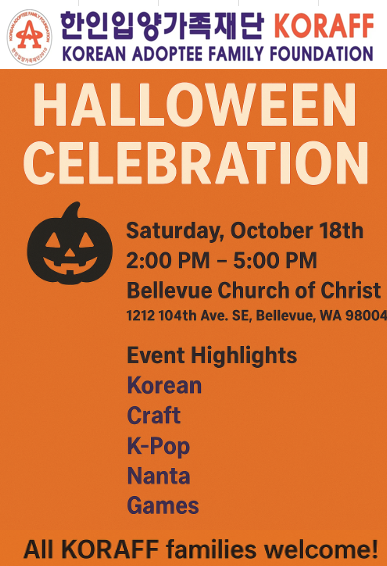 한인입양가족재단(KORAFF: 이사장 정소진)은 오는 18일(토) 오후 2시부터 5시까지 벨뷰 처치 오브 크라이스트(Bellevue Church of Christ, 1212 104th Ave. SE, Bellevue, WA 98004)에서 '할로윈 축제'를 개최한다.