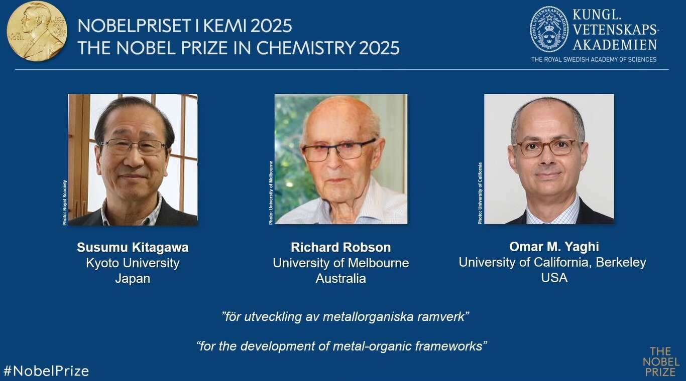 스웨덴 왕립 카롤린스카연구소 노벨위원회는 이날 "금속 유기 골격체 개발 공로로 기타가와 스스무 교수, 리처드 롭슨 교수, 오마르 M.야기 교수에게 노벨 화학상을 수여하기로 결정했다"고 밝혔다.