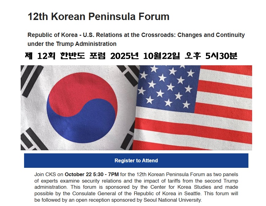 등록은 워싱턴대 한국학센터 홈페이지(https://jsis.washington.edu/korea/news/oct-22-the-12th-korean-peninsula-forum/)를 통해 진행된다.