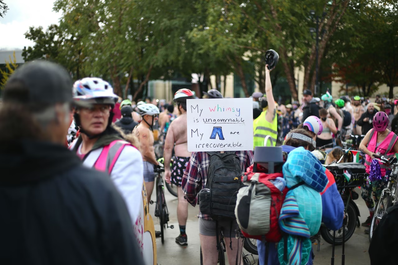 오리건주 포틀랜드에서 시민들이 트럼프 대통령 행정부의 연방군 투입 시도에 항의하기 위해 전원 혹은 반나체로 자전거를 타는 시위를 벌였다. 도시 특유의 자유롭고 풍자적인 문화가 시위 현장에서도 고스란히 드러났다.