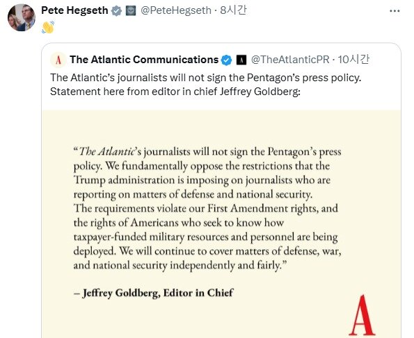 피트 헤그세스 미국 국방장관이 언론사들의 보이콧 선언에 조롱 섞인 반응을 보여 논란이 일고 있다. 헤그세스 장관은 최근 국방부가 도입한 새로운 언론 접근 규정에 서명하지 않겠다는 주요 언론사들의 입장 표명에 대해, 작별하며 손을 흔드는 이모지를 SNS에 남기며 일괄적으로 응답했다.