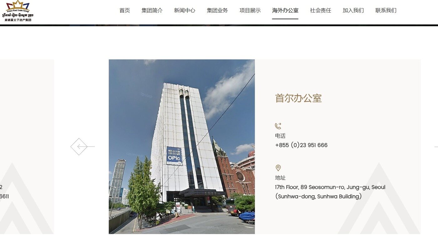 16일 국회 행정안전위원회 소속 서범수 국민의힘 의원실에 따르면 프린스그룹의 부동산 계열사 '프린스 리얼이스테이트 그룹'은 홈페이지를 통해 서울 중구 순화동에 '한국사무소'가 있다고 안내하고 있다. 다만 기재된 연락처는 캄보디아 국가번호다.