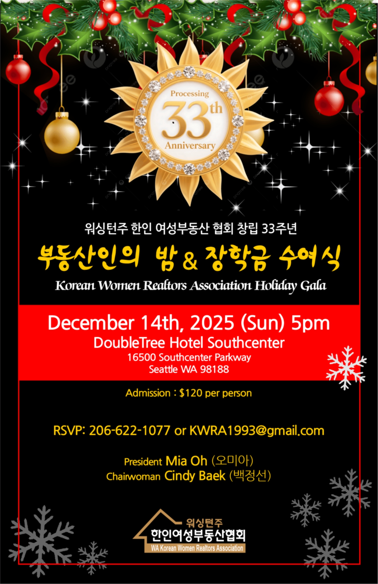 워싱턴주 한인여성부동산협회(회장 오미아ㆍ이사장 백정선)는 다사다난했던 2025년도를 마감하면서 연례 송년행사인 ‘부동산인의 밤 및 장학금 수여식’을 개최한다.