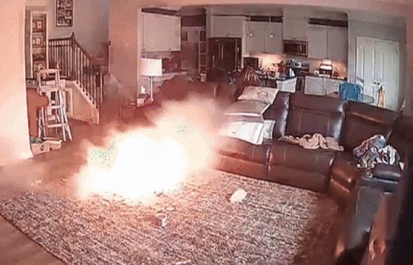 집에 도착한 새서는 CCTV 영상을 확인하고 깜짝 놀랐다. 영상 속에는 그의 반려견 콜튼이 리튬이온 배터리가 들어 있는 휴대용 기기를 입에 물고 놀다가 내려놓는 순간 불꽃이 튀며 순식간에 불길이 번지는 장면을 발견했다.