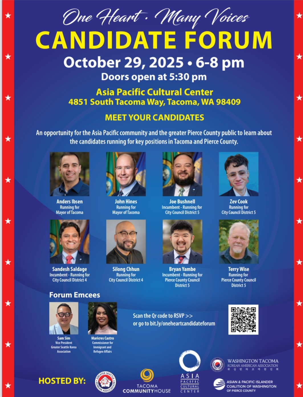 이번 토론회는 '하나의 마음, 여러 목소리'(One Heart · Many Voices)라는 슬로건 아래, 타코마와 피어스카운티의 주요 선거 후보자들이 직접 참여해 정책 비전과 지역사회 발전 방안을 제시하는 자리다.