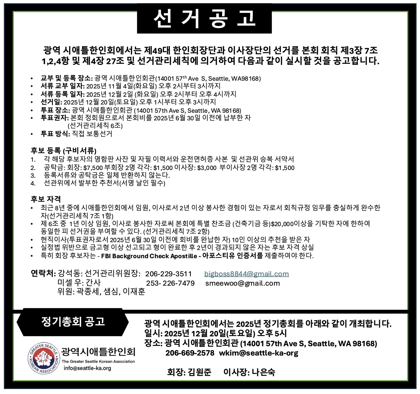 선거 관련 문의는 강석동 선거관리위원장(206-229-3511, bigboss8844@gmail.com