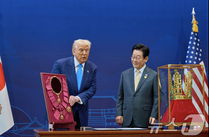 이 대통령은 전날(29일) 한미정상회담에 앞서 트럼프 대통령에게 우리 정부 최고 훈장인 '무궁화 대훈장'을 서훈하고, 특별 제작한 천마총 금관 모형을 선물했다.