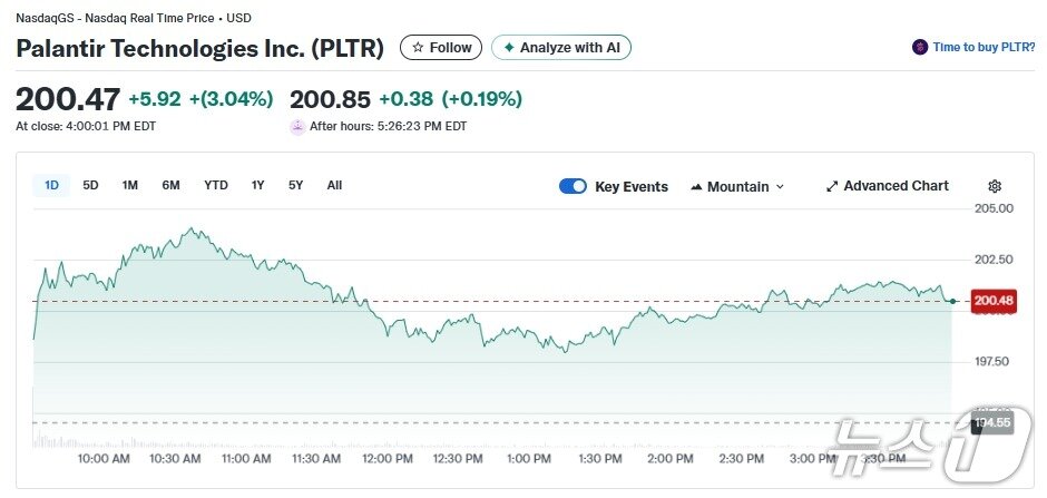 지난달 31일(현지 시각) 뉴욕증시에서 팔란티어는 3.04% 급등한 200.47달러를 기록했다. 이는 사상 최고치다. 이로써 시총도 4755억달러로 늘었다. 이는 삼성전자와 비슷한 수준이다.