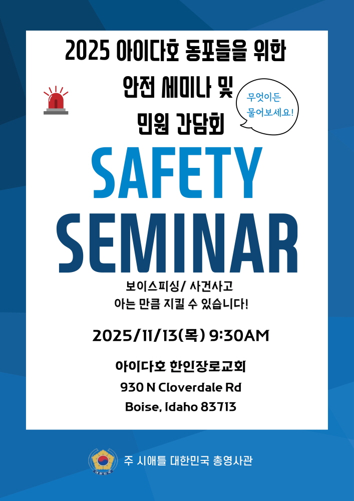 안전세미나 및 민원간담회는 순회영사가 진행되는 기간인 오는 13일 오전 9시30분 아이다호 한인장로교회(930 N Cloverdale Rd, Boise, ID 83713)에서 열린다.