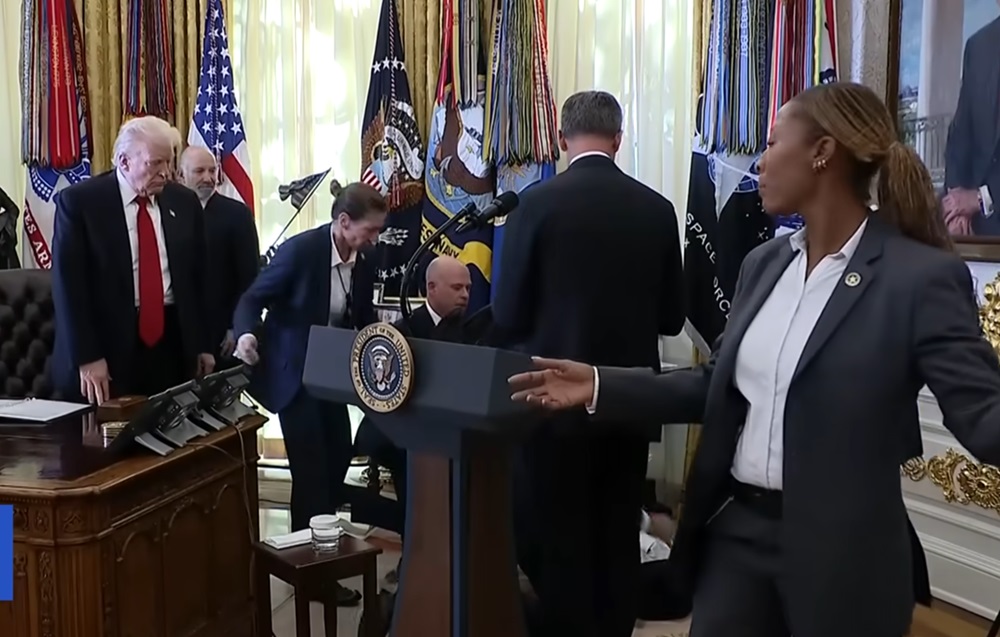 6일(현지시간) 열린 백악관 행사에서 참석자가 실신하는 소동이 벌어지는 동안 도널드 트럼프 미국 대통령이 멀뚱히 선 모습이 카메라에 포착됐다.