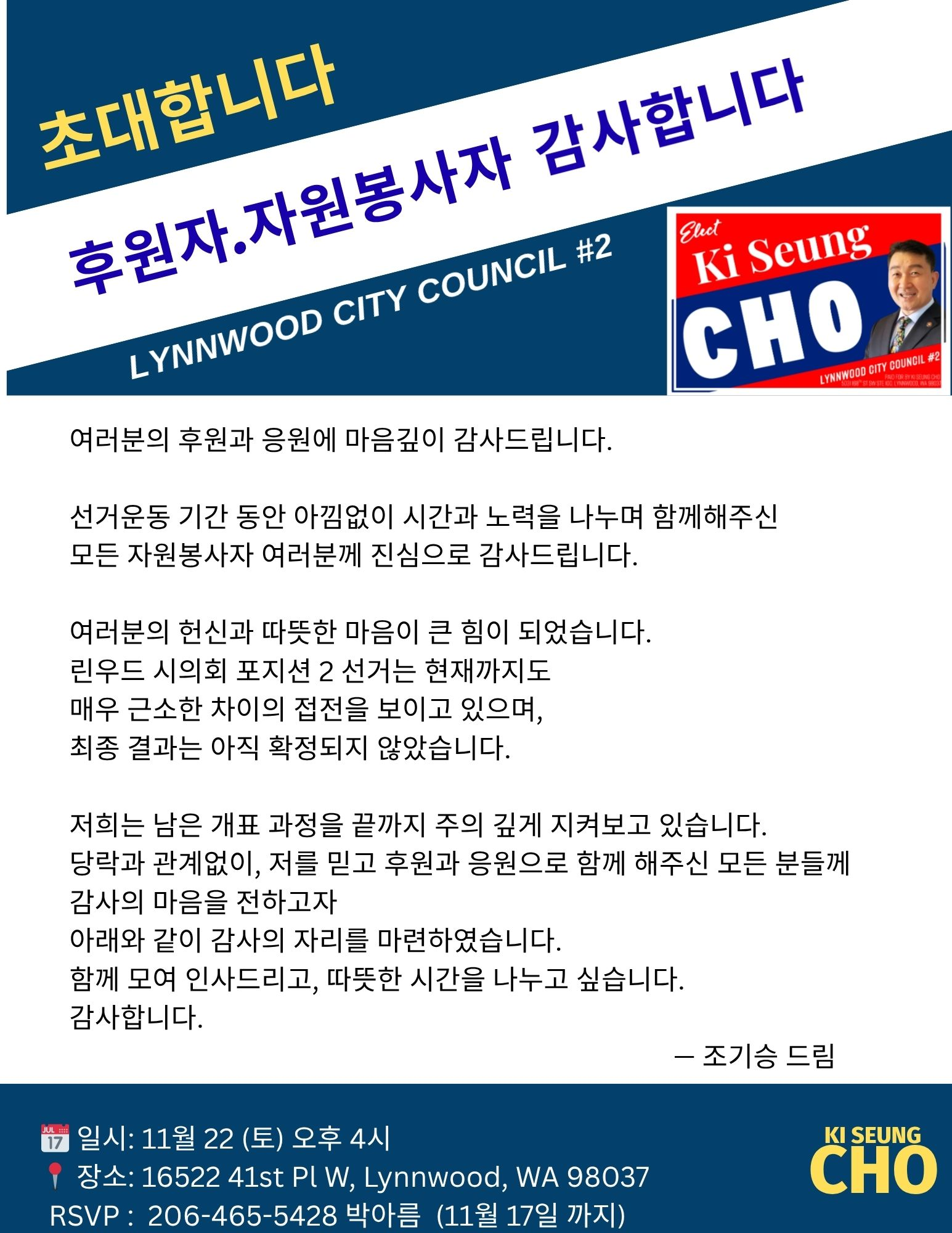 한인 1세로 한인밀집지역인 린우드 시의원(포지션 2)에 도전장을 내민 조기승 서북미연합회장이 근소한 표차를 이어가고 있는 가운데, 선거운동 기간 동안 함께한 지지자와 자원봉사자들에게 감사의 뜻을 전하는 ‘감사 모임’(Thank You Party)를 마련한다.