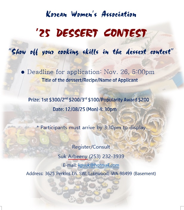 대한부인회(KWA, 이사장 박명래) 평생교육원(원장 켈리 류)이 오는 12월 8일(월) 오후 4시30분, 레이크우드 본관 지하 강당에서 ‘2025 디저트 콘테스트(’25 Dessert Contest)’를 개최한다.