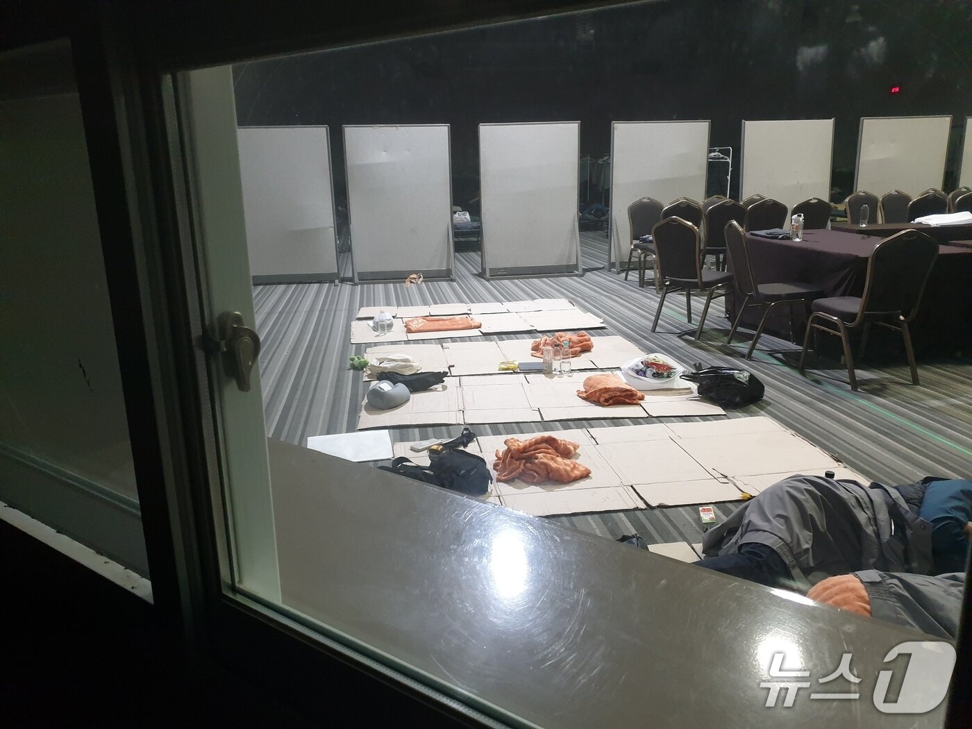 사진에는 행사장 바닥에 박스를 펴 깔고, 주황색 모포를 이불 삼아 잠을 청하는 경찰관들의 모습이 담겼다.