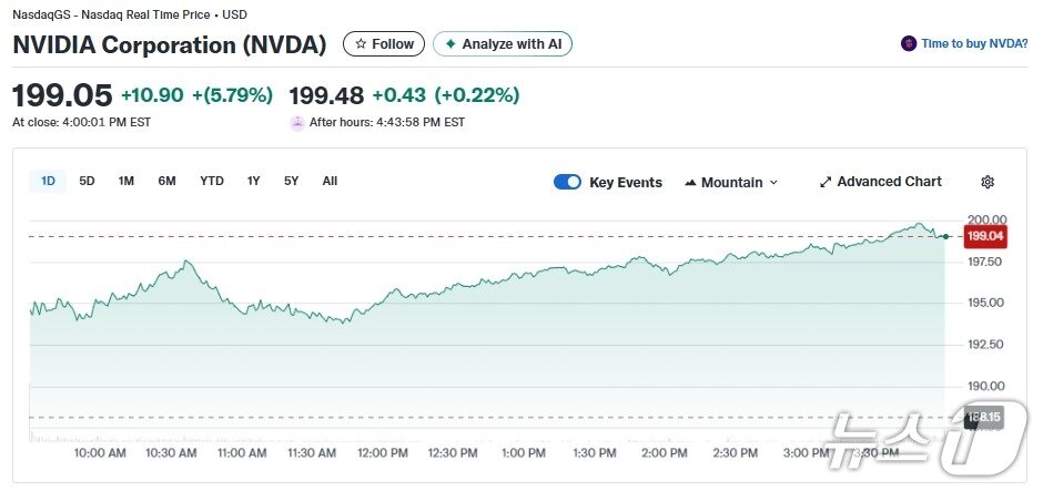 10일(현지 시각) 뉴욕증시에서 월가의 대표적 AI 주 엔비디아는 5.79% 급등했다.