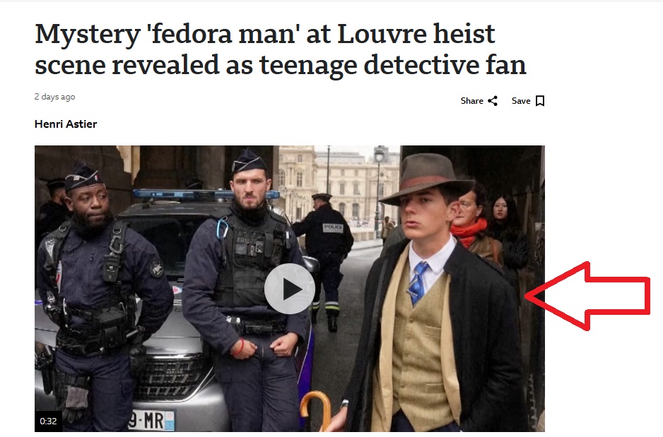 지난달 프랑스 파리 루브르 박물관에서 발생한 1억 200만 달러(약 1500억 원) 규모의 보석 절도 사건 당시 박물관 현장에 나타난 중절모와 정장 차림의 청년 사진이 화제가 됐다.