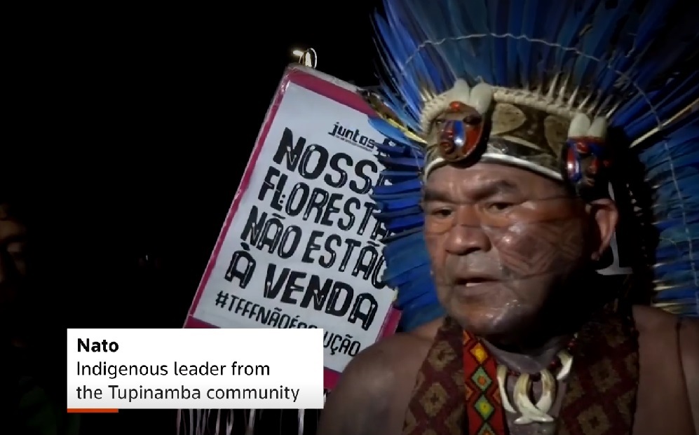 이날 시위에서 투피남바 부족 지도자 나토는 상기된 목소리로 "우리는 돈을 먹을 수 없다"며 "우리 땅이 농업, 석유탐사, 불법 채굴과 벌목으로부터 자유로워지길 원한다"고 목소리를 높였다.