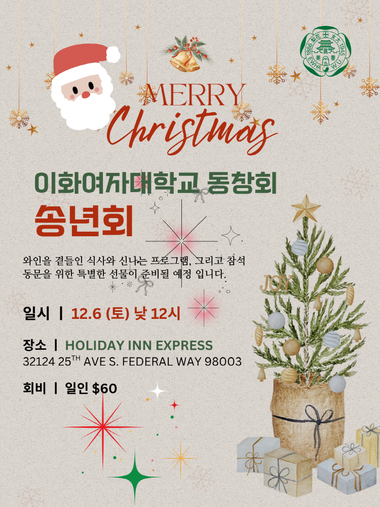 이화여대 시애틀동창회(회장 이(김)희정)가 오는 12월 6일(토) 낮 12시 페더럴웨이 할리데이 인 익스프레스에서 올해 송년모임을 연다. 이번 행사는 한 해를 돌아보며 동문 간의 우정을 더욱 돈독히 하고, 서로의 근황을 나누며 따뜻한 연말을 함께 보내기 위한 자리다.