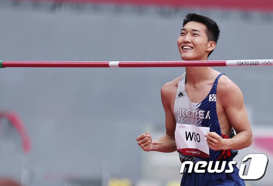 육상 대표팀 우상혁이 30일 오전 일본 도쿄 신주쿠 올림픽스타디움에서 열린 '2020 도쿄올림픽' 남자 높이뛰기 예선전에서 2.17m를 성공한 후 기뻐하고 있다. 우상혁은 이날 한국 육상 25년만에 결선에 진출하는 쾌거를 기록했다. 2021.7.30/뉴스1 © News1 이재명 기자 |