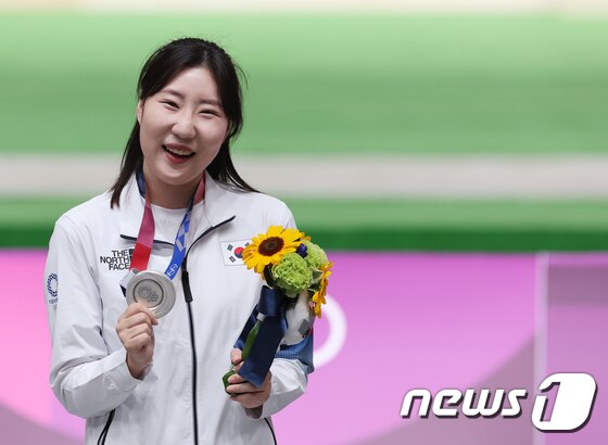 대한민국 사격 김민정이 30일 오후 도쿄 아사카 사격장에서 열린 '2020 도쿄올림픽' 여자 권총 사격 25m 시상식에서 은메달을 들고 기뻐하고 있다. 2021.7.30/뉴스1 © News1 이재명 기자 |
