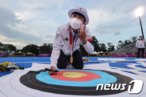 양궁 안산이 30일 일본 도쿄 유메노시마 공원 양궁장에서 열린 '2020 도쿄올림픽' 여자 개인전 시상식을 마치고 과녁판에 사인을 하고 있다. 2021.7.30/뉴스1 © News1 송원영 기자 |