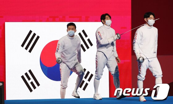 펜싱 대표팀 박상영과 권영준, 송재호 등 선수들이 30일 오후 일본 도쿄 미쿠하리 메세 B홀에서 열린 '2020 도쿄올림픽' 남자 단체 에페 동메달 결정전에서 입장하고 있다. 이날 대한민국 펜싱 대표팀은 동메달을 획득했다. 2021.7.30/뉴스1 © News1 이재명 기자 |