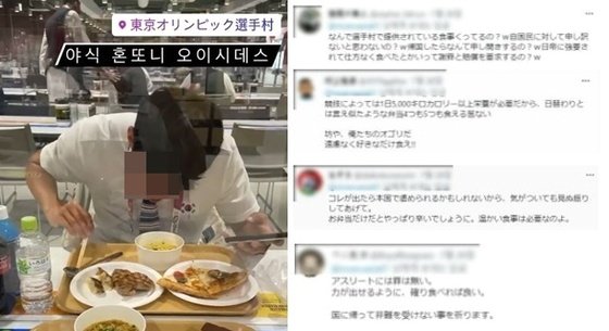 도쿄올림픽에 출전한 한국 대표팀이 자체적으로 음식을 공수해 도시락을 조달하고 있는 가운데, 최근 한 한국인이 태극마크를 단 옷을 입고 일본 선수촌에서 식사를 하며 일본어로 "야식 맛있다"는 글을 올려 일본에서 큰 화제가 됐다.
