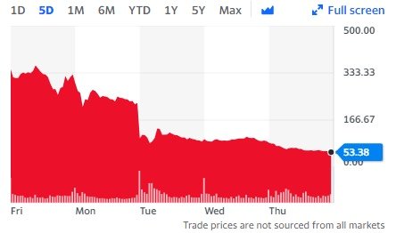 게임스톱은 4일(현지시간) 뉴욕증시에서 전 거래일보다 42.11% 폭락한 53.50 달러를 기록했다. 이는 지난주 최고가 483달러 대비 1/10수준이다. 최근 게임스톱은 연일 폭락하고 있다.