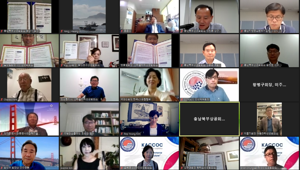 화상회의 툴인 줌을 통해 이뤄진 이날 MOU 체결 행사에는 미국내 지역 상공회의소 회장은 물론 영 김 연방 하원의원, 백양순 한국 ICT융합협회 회장, 신성식 충남중기청장, 박영민 KOTA 실리콘밸리 관장, 정재훈 샌프란시스코 영사, 조범근 달라스 영사 등이 50여명이 참석했다