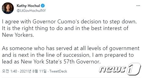 호컬은 이날 트위터에 "쿠오모 주지사의 사임 결정에 동의한다"며 "모든 정부 직급에서 근무해본 경험을 토대로 57대 뉴욕 주지사로 취임할 준비를 마쳤다"고 적었다.