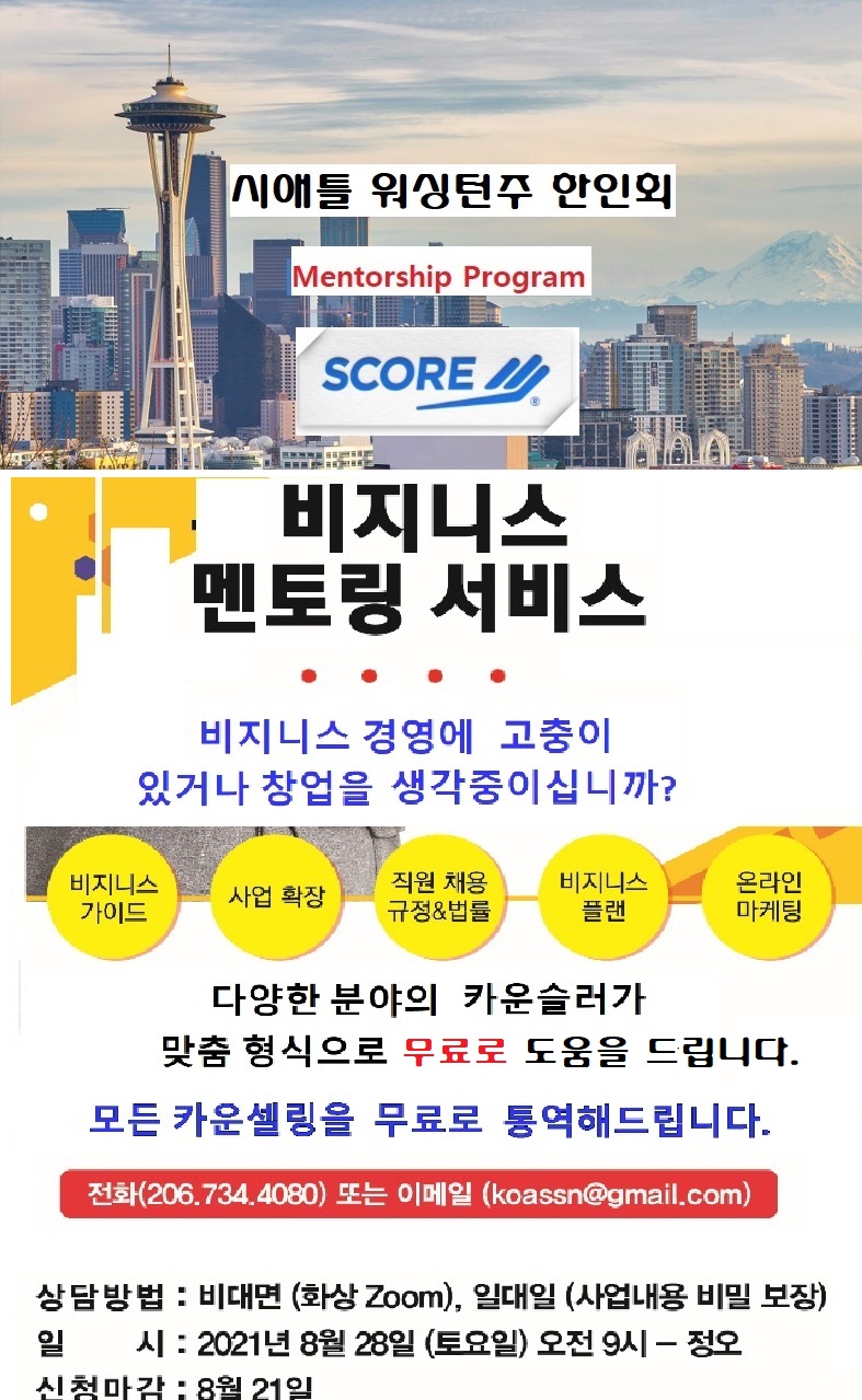 시애틀한인회는 미국 스몰 비즈니스 지원 비영리단체인 SCORE(https://www.score.org)와 공동으로 28일 실시하는 2차 멘토링 서비스 참가자에 몇명의 여유가 생겨 오는 25일까지 추가로 접수를 받는다고 밝혔다.