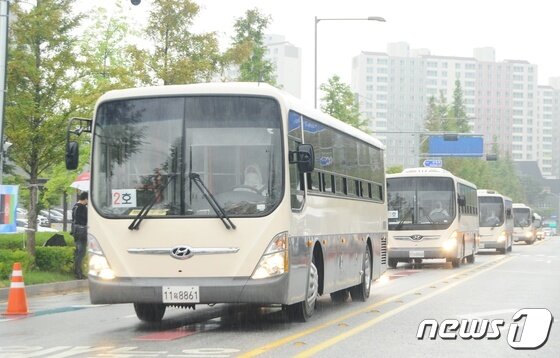26일 오후 공군 수송기편으로 입국한 아프가니스탄인들을 태운 버스가 충북 진천 소재 국가공무원 인재개발원에 도착하고 있다. 2021.8.27/뉴스1 © News1 김정수 기자 |