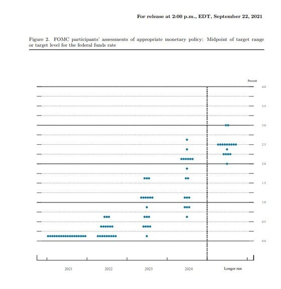 내후년 2023년까지 금리는 최소 3차례 인상될 것으로 전망됐다. 지난 6월 점도표보다 금리인상 예상횟수가 1차례 늘어난 것이다. 2024년 금리 전망이 처음으로 나왔는데 중간값은 1.8%으로 그해 최소 금리가 3번 올라갈 것으로 예상된다.