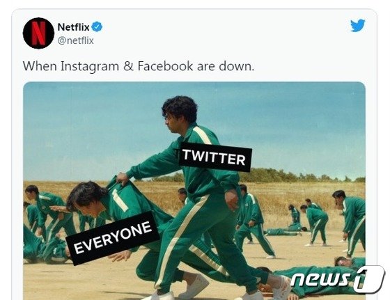 넷플릭스는 이날 공식 트위터를 통해 페북의 먹통 소식을 전하며 최근 전세계적으로 유행하고 있는 오징어 게임 밈(인터넷 유행 콘텐츠)을 이용했다.