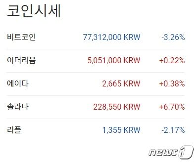 같은 시각 한국의 거래사이트인 업비트에서도 비트코인은 24시간 전보다 3.26% 하락한 7731만2000원에 거래되고 있다.