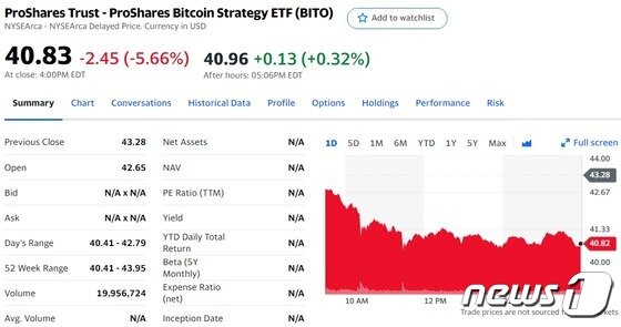 한편 비트코인이 하락하자 비트코인 ETF도 하락하고 있다. 이날 비트코인 ETF인 '비토'는 뉴욕증권거래소(NYSE)에서 전일보다 5.66% 급락한 40.83달러를 기록했다. 비토의 시초가는 40달러다.