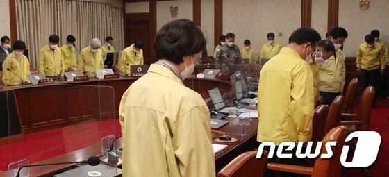 27일 서울 종로구 정부서울청사에서 열린 2021년 을지 국무회의에서 김부겸 국무총리와 국무위원들이 전날 서거한 노태우 전 대통령을 애도하며 묵념을 하고 있다.2021.10.27/뉴스1 © News1 송원영 기자 |