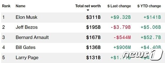 블룸버그 억만장자지수에 따르면 1일 현재 머스크의 개인재산은 3110억 달러로, 2위인 제프 베이조스 아마존 창업자(1950억 달러)를 1000억 달러 이상 차이로 따돌리며 압도적인 1위를 달리고 있다.