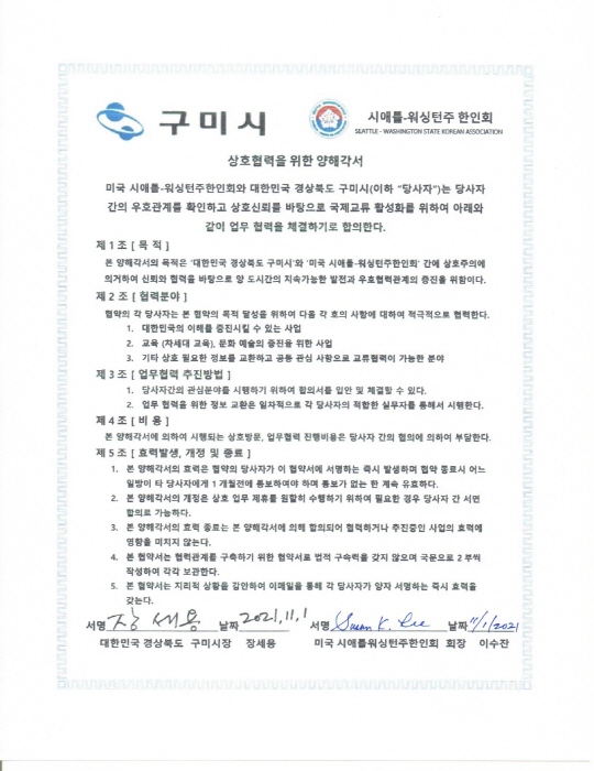 시애틀 워싱턴주한인회(회장 이수잔, 이사장 홍윤선)가 1일 한국 경북 구미시(시장 장세용)와 상호 우호 및 교류협력을 위한 양해각서(MOU)를 체결했다.