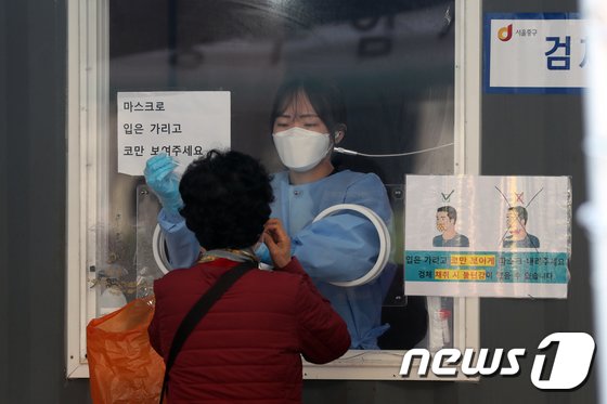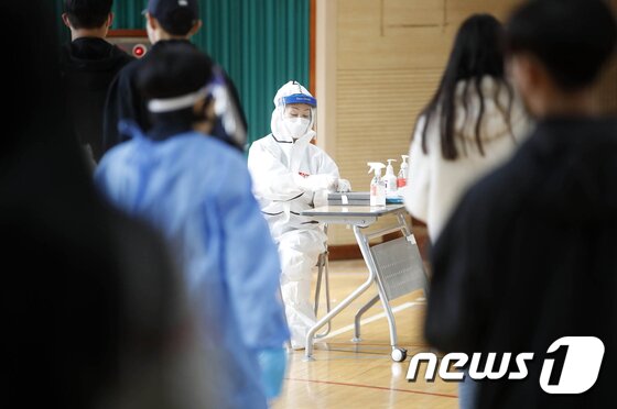 2일 오전 광주 북구 한 중학교에 마련된 신종 코로나바이러스 감염증(코로나19) 임시선별진료소에서 교직원과 학생들이 진단검사를 받고 있다.(광주 북구 제공)2021.11.2/뉴스1 © News1 정다움 기자 |