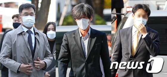 <경기 성남시 대장동 개발 특혜 의혹과 관련해 김만배씨(왼쪽부터), 남욱 변호사, 정민용 변호사가 3일 서울 서초구 중앙지방법원에서 열린 영장실질심사에 출석하고 있다. 2021.11.3/뉴스1 © News1 안은나 기자,성동훈 기자>