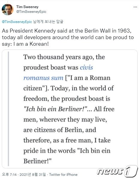 구글·애플 등 앱마켓 사업자들의 인앱 결제 강제화를 막는 '구글갑질방지법' 통과 소식에 자신의 트위터를 통해 "나는 한국인이다!"며 환영의 뜻을 밝힌 팀 스위니 에픽게임즈 대표가 한국을 방문한다.