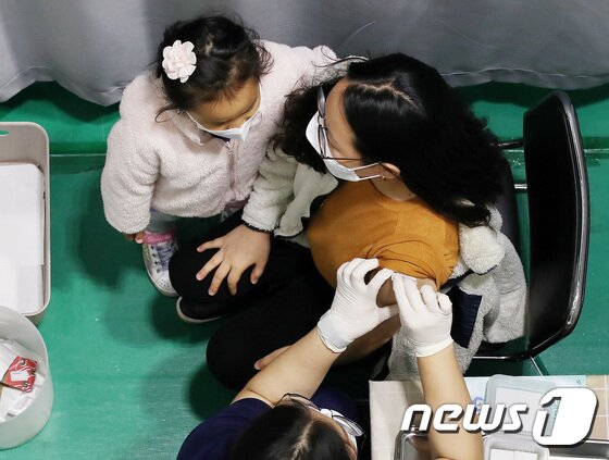 서울 서대문구 북아현문화체육센터에 마련된 신종 코로나바이러스 감염증(코로나19) 백신 예방접종센터에서 한 어린이가 백신접종 전 긴장하는 엄마를 안아주고 있다./뉴스1 © News1 박지혜 기자 |
