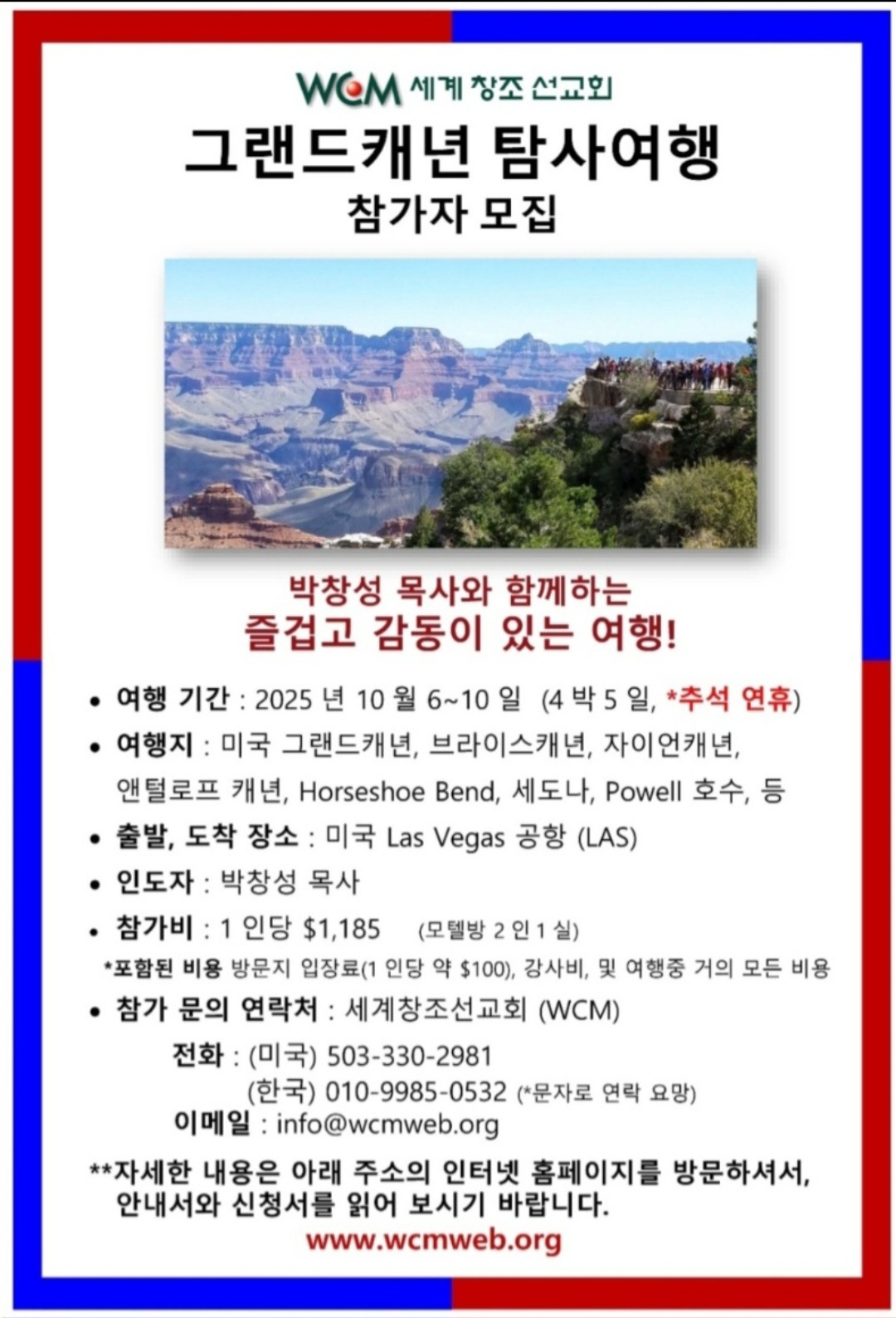 세계창조선교회에서는 그랜드캐년 탐사여행을 준비하고 참가자를 모집합니다.